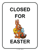 A sign, illustrated with a bunny and basket, letting customers or clients of a store or office know that the business or agency is closed for the Easter holiday.